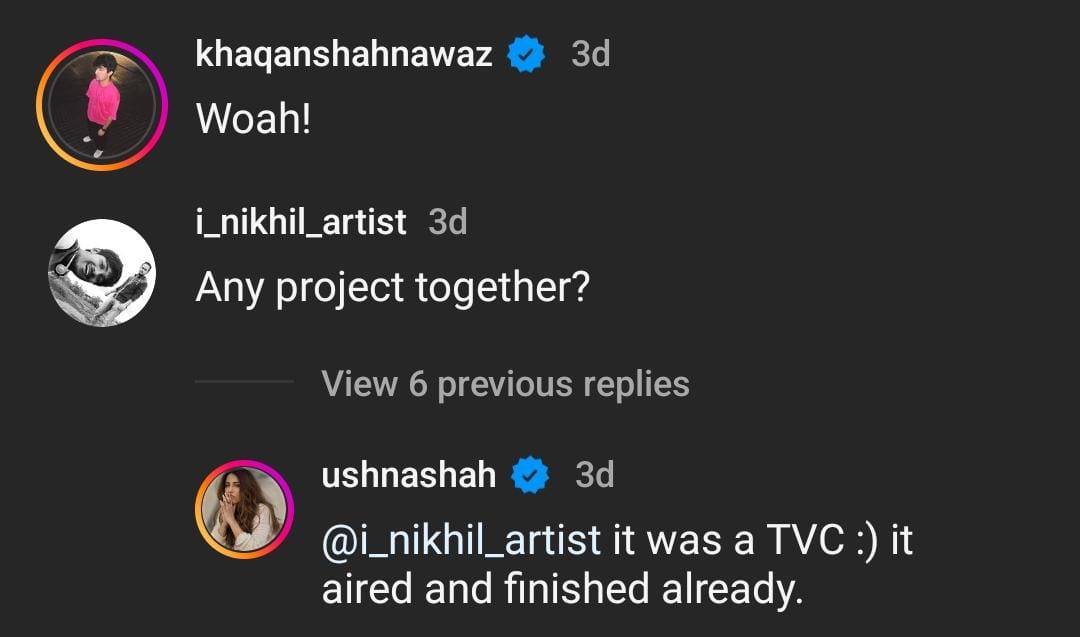 As soon as Ushna posted her photo with Anurag with such a caption, netizens poured their heart out in the comment section. When one user quizzed about her upcoming projects with Anurag and wrote, “Noooo wayyyy (fire emojis),” Ushna replied, “Haha yes way! That’s why I’m so pro-auditions, everyone gets a chance for cool projects even if they’re not in inner circles. Imagine if that starts happening here.” Another comment can be read as “Bollywood’s very own Tarantino (Hollywood filmmaker Quentin Tarantino). Nawaz (Nawazuddin Siddiqui), Vicky Kaushal, Rajkummar Rao, Pankaj Tripathi, and so many other stars were made because of Anurag.” One more netizen asked Ushna about her next project, to which she mentioned: